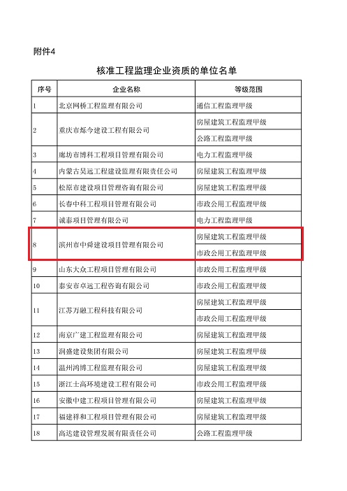 2019年4月2日,國(guó)家住房和城鄉(xiāng)建設(shè)部正式公布核準(zhǔn)我公司房屋建筑工程監(jiān)理、市政公用工程監(jiān)理甲級(jí)資質(zhì)。此次資質(zhì)的成功升級(jí)是我公司資質(zhì)建設(shè)的又一個(gè)里程碑。 資質(zhì)升級(jí)成功后,公司在工程監(jiān)理領(lǐng)域?qū)⒂瓉?lái)更廣闊的發(fā)展空間,也標(biāo)志著我公司在監(jiān)理行業(yè)中將具備更高的水準(zhǔn)。